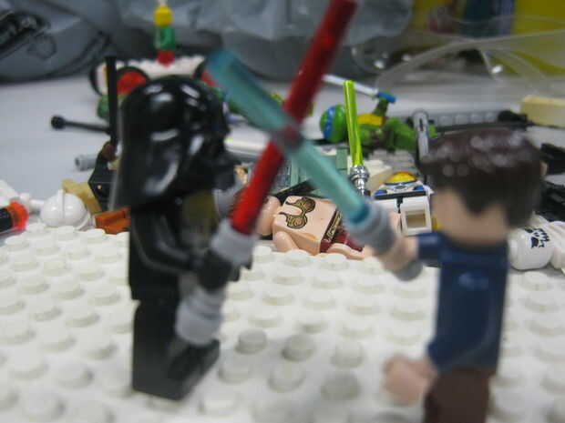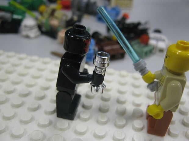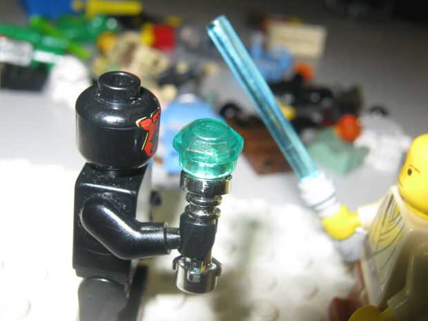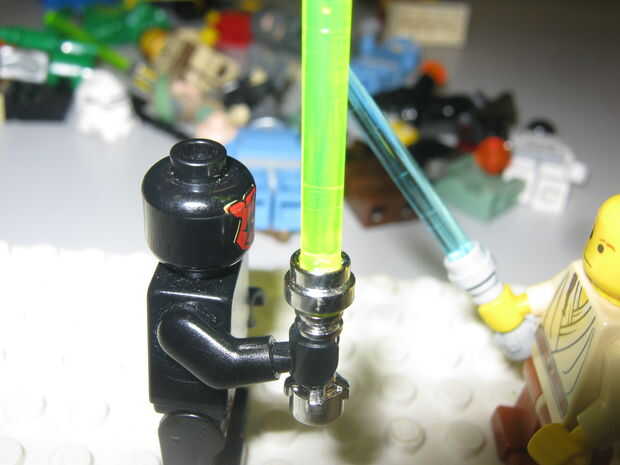 Cuando se enciende el sable de luz, podría iniciar con el mango y luego añadir la lámina en el siguiente tiro, sin embargo, se verá mucho mejor si pones una pequeña pieza de Lego en el mango entre las etapas de ser encendido y apagado. Lo es mirada como un relámpago, y que la hoja está saliendo de la manija, por lo que no sólo aparece en.