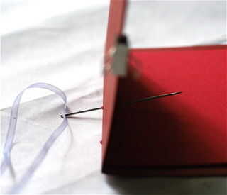Tomar su aguja roscada e ir en el orificio central desde el exterior del libro, deja una cola de por lo menos 3-4 pulgadas de hilo o la cinta.