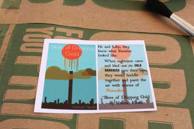 Libro de hoy estoy usando como una demostración es un libro que está muy cerca de mi corazón: cielos de goteo oro por Hannah Heath. Es un cuento corto, pero desgarrador de fe, lealtad y perseverancia, y lo recomiendo a usted bigtime: cielos de goteo oro en Amazon. Solo revisa esas hermosas cubiertas. La espalda es una de mis frases favoritas del libro. (Y no, no tiene nada que ver con el hecho de que el autor es mi amigo).