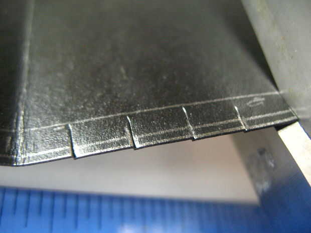 Mida y marque una línea corta cada 2/8 de pulgada en la parte inferior y superior de la columna vertebral. Puedes ver que esto es en la foto.