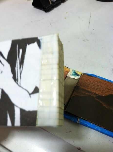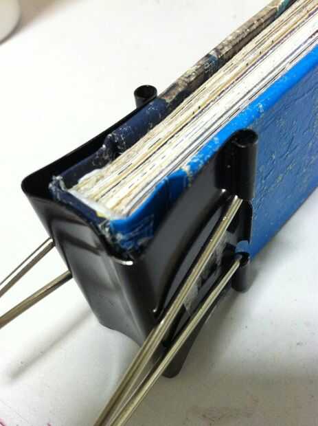 palmada todos juntos. con precisión, por supuesto! otra capa de pegamento a la columna vertebral y prensa que abajo entre las hojas de cubierta. también, agregue el pegamento extra a la espina dorsal de la cubierta y pellizcar con una abrazadera que seque durante la noche.