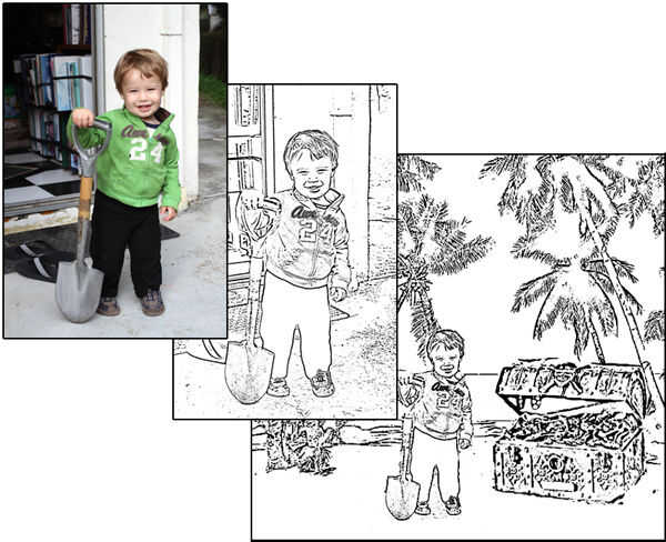 Por supuesto, no debe utilizar fotos familiares. Incluso analizaremos cómo insertar miembros de su familia en emocionantes escenas de acción y paisajes lejanos. Es su libro para colorear, para que pueda elegir la historia! Mejor aún, ¿por qué no dejar que los niños decidan?