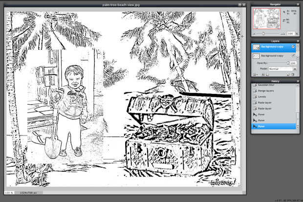 reuní todas mis imágenes en una sola imagen compuesta por simplemente haciendo clic en las capas que quería en la paleta de capas y luego arrastrarlas a la ventana que contiene mi imagen de la playa de fondo. Esto me dejó con una sola imagen que contiene tres capas: la playa, tesoro de pecho y el niño.