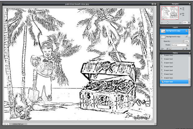 Luego, usé la herramienta de r Borraren cada capa para recortar a los no deseados rectangulares bordes y fondos del cofre del tesoro y el niño. El borrador sólo actuará sobre cualquier capa seleccionado, lo que es fácil de modificar un elemento de la imagen a la vez.
