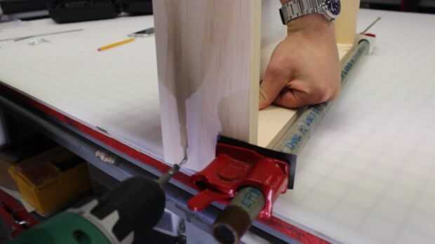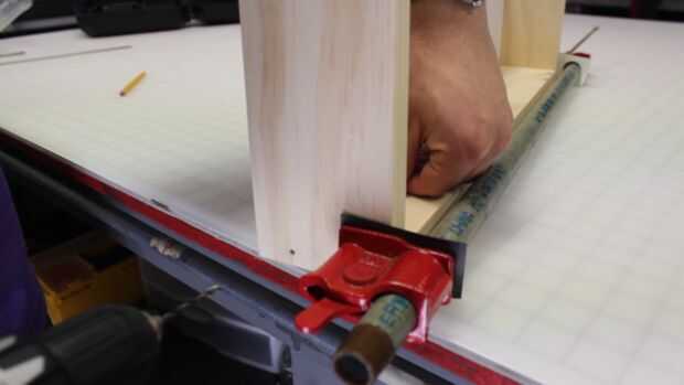 Montar el fondo y los 2 lados. Mina tenía con una abrazadera de tubo. Marca de una pulgada de lado y 3/8" de la parte inferior. Luego perfore un agujero piloto y añadir un tornillo para madera. Repita este proceso 3 veces más en la parte inferior. Habrá 2 tornillos a cada lado.