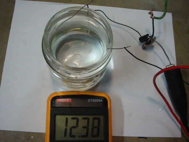 El emisor debe ir a la negativa de la fuente de alimentación. El colector debe ir a la negativa de su dispositivo en este caso un multímetro. Lo positivo de la fuente de alimentación debe ir al positivo de tu dispositivo. El segundo cable del sensor debe conectarse a la fuente de alimentación +. Usted puede poner un trozo de alambre de acero en cada cable del sensor como electrodos. Colocar los electrodos en agua corriente y usted debería ver el transistor encienda y permita que la energía fluya a través.