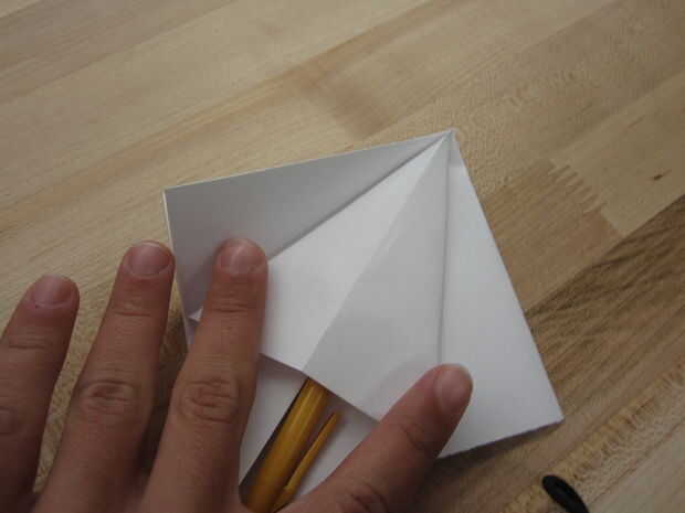 abrir a cada una de las alas y doble hacia abajo a través de los pliegues.  (Sugerencia: es más fácil conseguir una esquina mejor si utiliza un lápiz para ayudar a doblar.)
