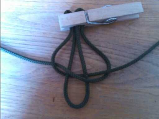 Luego traer la pieza izquierda del cordón bajo el bucle medio y (encima) el pedazo derecho de cuerda. Ahora debería verse como la segunda foto. Llevar el pedazo derecho de cuerda; con la parte izquierda todavía en él en el medio y a través del lazo en el lado izquierdo. Debe mirar como lo hace en la tercera imagen. Si no te han hecho bien y sólo hay que tire firmemente. (cuanto más mejor) En este momento vas a querer de la clavija.