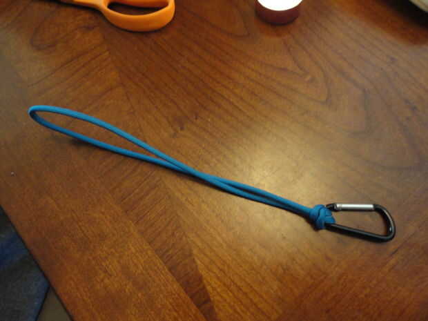 Primero te agarras mosquetón entonces, con el paracord hacer un doble sobre el nudo de la mano. (Nota: para no ver los extremos, pero no quieres también no quieren el paracord para desatar.