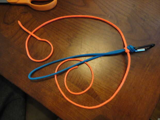 Paso 1: materiales ·2 1/2 pies de paracord o cadena similar· clave o claves·Nut, lavadora o cualquier otro objeto con un orificio de al menos 2 mm de diámetro·scissors·LighterPaso 2: a partir de Tomar un extremo y poner a través del orificio de las t