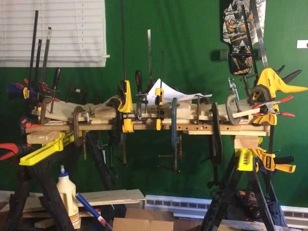 Después de que la prensa se ha completado. Inmediatamente después de pegado colocar las capas en la prensa y comenzar a aplicar presión con las abrazaderas en C. Trate de mantener la presión incluso a lo largo de la Junta usando el mismo tamaño/estilo abrazadera en cada extremo. Uso un amigo para este paso, ayuda a mantener la presión exacta. Las capas se comenzarán a doblar al diseño que haya creado en la prensa. Si oye craqueo: Parar y aflojar la abrazadera para evitar estropear las capas. Revise para ver de donde vino el craqueo (en mi prensa, agrietamiento se escuchó, pero después de comprobar todo lo descubrió que la prensa había roto en dos. Lección aprendida, use maderas fuertes para prensa.)