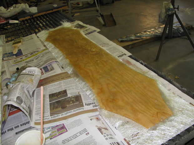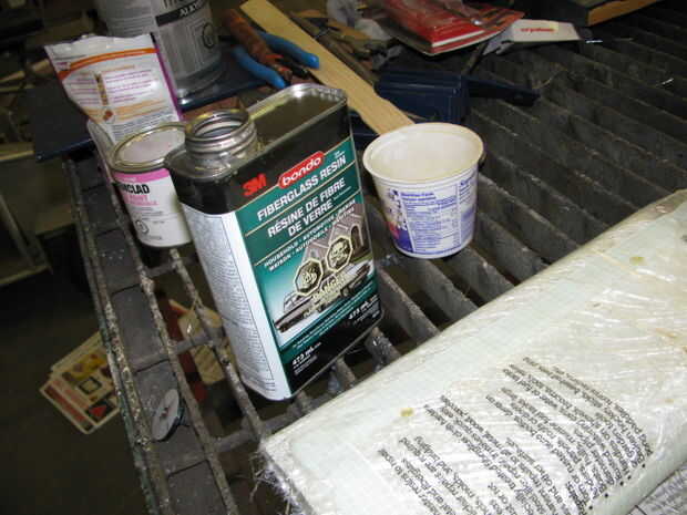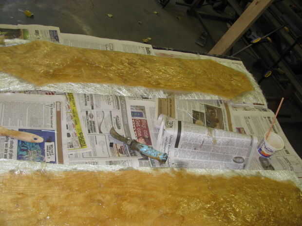Ahora es el momento de fiberglss el bottem. Tome su estera de fibra de vidrio y colóquelo en el bottem de la cubierta de tabla larga. Mezcle la resina según las instrucciones que vienen con él. Aplique la resina sobre la estera de fibra de vidrio y deje seco según las instrucciones.