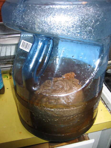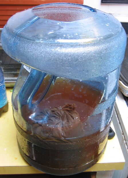 Corté la parte superior de una bombona de plástico de agua de manantial para hacer el cubo de cerveza visto aquí.