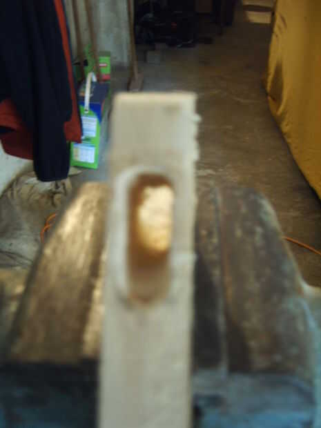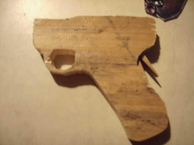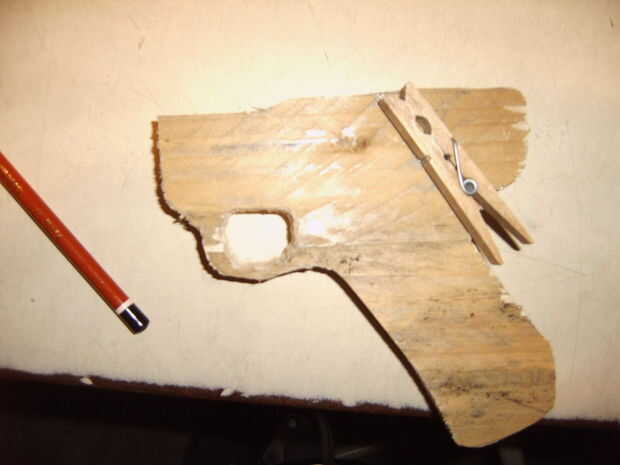 Ahora en este primer agujero el clothingpin probablemente no cabrá. Por lo tanto debe sacar de su archivo y hacer el agujero más grande (foto 4). No olvides presentar la abertura más grande en la parte posterior de la pistola. De lo contrario su clothingpin no será paralelo a su manija! No puedo realmente decirte mucho acerca de cómo es grande el agujero debe estar como se diferencia de clothingpin a clothingpin. Sólo asegúrese de que el clothingpin se ajusta en el agujero y que pueden abrir. No necesita ser mucho sólo lo suficiente para cargar fácilmente y tiene la goma dispara. Mi agujero era 3 cm de largo y 1 cm de ancho.