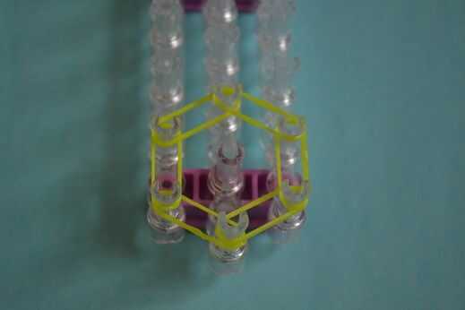 Combinar granos de acrílico y colores gomas para hacer esta bola de telar de arcoiris 3D lindo fácil! Necesitarás 7 gomas de colores (puede encontrarse en Pandahall.com ) para hacer esta bola de banda elástica. Esta bola de telar del arco iris colgan