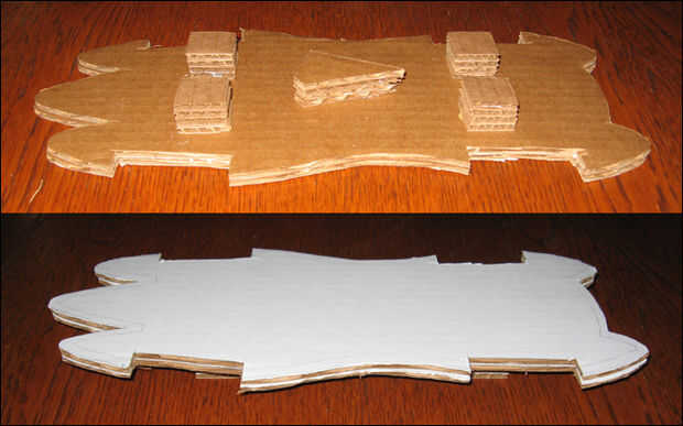 Luego con la izquierda sobre desechos corté bastantes plazas y desechos para igualar los 5 pilares de capas de cartón 4 alta. Luego pega 4 piezas para formar el 1 Pilar y luego pega los 5 pilares en la parte inferior de la coche outlin/huella, un poco en para que fácilmente no ser visto pero aún apoyar la torta y que sala fot las ruedas. Luego cubrí el contorno/la huella en papel de aluminio.