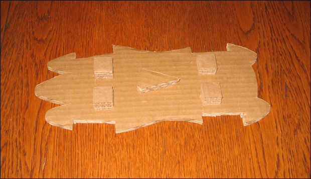 Dibujé una contorno/forma general de Mach 5, como si mirando hacia abajo en él desde arriba, en una mitad de lo tablero de la torta. Luego recórtalo y rastrear su forma sobre la otra mitad de la Junta y recortar demasiado y caliente pegado junto por lo que sería más robusto para soportar el peso de la tarta y el fondant. Como una "huella" el pastel se sentaría en. Cortan las áreas a los lados de este para dejar espacio para los neumáticos más adelante ya que este espacio sería en la parte inferior de la torta.
