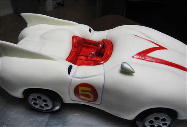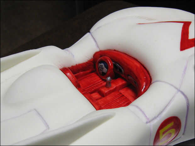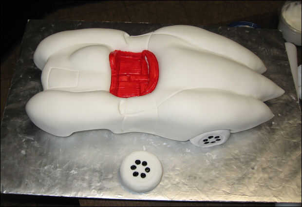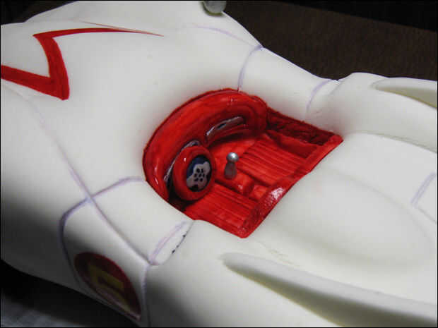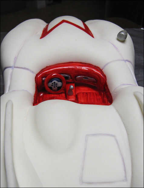 Luego vino el guión. Me formó con fondant, pegado en su lugar, poner algunos simples detalles como marca de la ronda y la guantera. Luego lo pinté con los colorantes.