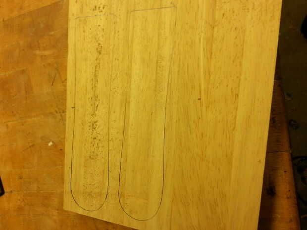 El primer paso es trazar la forma de su asa en un pedazo de la acción. El mango debe ser aproximadamente 1" de espesor y una madera muy durable. Bosque aceptable utilizar sería ceniza, nogal americano o roble. Tenía algunos restos de ceniza que fueron 1" espesor en mi cubo de madera que funcionó a la perfección. Una fuente de madera para las manijas alternativa podría ser una plataforma reciclada que contengan cualquiera de los anteriores bosques. Solo quita las gruesas tablas de la plataforma y plano o vuelve a serrar a 1" de espesor.