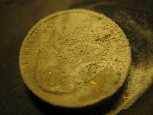 Coloque unos toques de pegamento en la superficie de la moneda y rociar con polvo de congelación apagado.