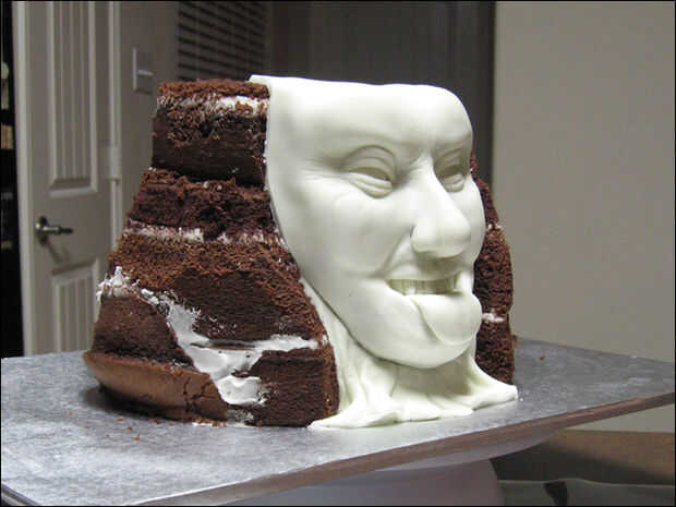 Añadido (fondant) ojos, lengua, dientes y labio superior por separado; uso de agua para pegar en la cara de pasta de azúcar. Me moje mis herramientas en un poco de agua y utilizarlos (combinado con el poquito de agua humedad) para mezclar en algunas de las piezas de pastillaje (fondant) añado.