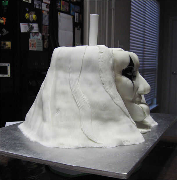 También he añadido algunos volantes de fondant (antes de añadir el pelo) por debajo de la barbilla para simular la parte de su atuendo. Otra vez pegado ellos con un poco de agua.
