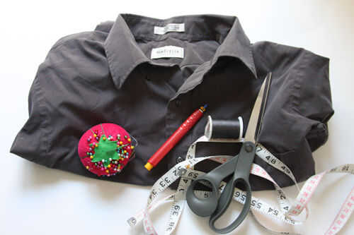 camisa Button-Down de los hombres 1 (mina era tamaño M, que encontré no era suficientemente ancha como cuando fui a hacer los cortos. Cualquier tamaño que usted se de señoritas (XS, S, M, L, XL), sugiero utilizar una camiseta que es 1 talla más grande en los hombres (por lo menos!). De lo contrario tendrás que salvar la tela de la camisa para añadir a la anchura exterior de los cortos... a menos que prefiera pantalones cortos apretados o delgado-guarnición en sus muslos.)