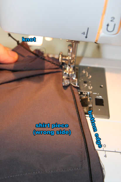 36. (Foto 2) nudo un extremo de la cuerda elástica y puntada libremente sobre ella, como cerca del borde inferior de la pieza de camisa como se pueda sin perder el borde de la misma.