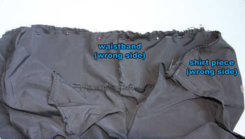 37. (Foto 3) perno de la pieza de camisa a la parte superior de la pretina, derecho lados juntos, que el centro de la espalda costuras y marcas y las costuras laterales y las marcas. Tire de la cuerda elástica para recoger a la tela de la camisa a la cintura como vas.