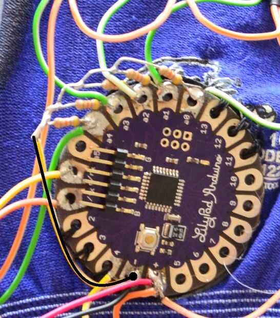 Así que siguiendo el esquema, primero Suelde la resistencia 5 en la placa LilyPad, un lado a los 5 pines analógicos diferentes, el otro en común a la tierra. Luego suelde los sensores de flexión, de un lado a las clavijas analógicas diferentes 5 y el otro en común al positivo.