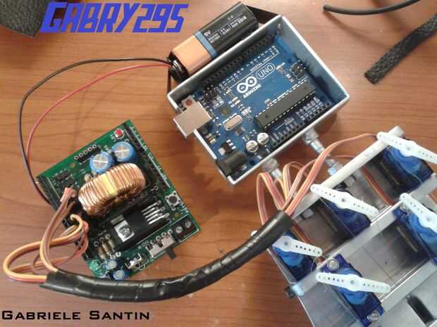 Los puertos USB de una computadora no pueden dar poder anough para controlar 5 servomotores, por lo que sugiero para utilizar una fuente de alimentación de 12V para probar todo y después utilizar la batería de 9V (alcalina son preferibles).