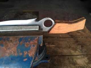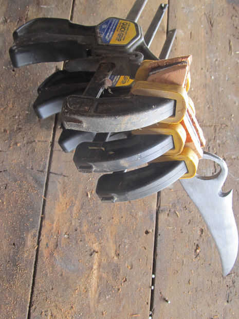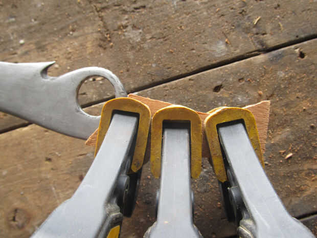 Esta es una parte muy importante en poner el mango en, si no se pega bien el mango podría, caer, deslizarse o crack. Si eso sucede es muy difícil bajar la cola. Así que asegúrese de que sus escalas son afianzado con abrazadera en muy apretado, como puedes ver que tengo tres pinzas que cubren el mango entero. Recomiendo dejar el pegamento creado durante la noche, esto asegura que sea curado 100%.