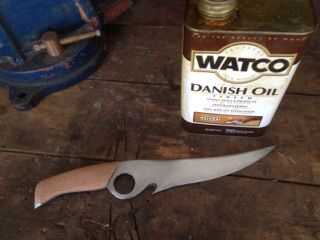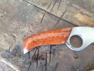 Ahora debes terminar el mango, me gusta tener la sensación de madera en mi asas usé un aceite de acabado. Se puede utilizar cualquier acabado, pero he sido muy feliz con el uso de aceite para mi manijas del cuchillo. Como se puede ver la madera de encaje realmente se saldrá con la apariencia de la cuchilla.