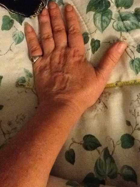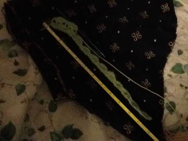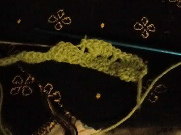Inicio ganchillo (o punto) para hacer un rectángulo de aproximadamente tres pulgadas más ancha que su mano es larga, incluyendo una pulgada de su muñeca, en este caso unas 12 pulgadas, y dos veces como usted lo desea. Yo se un simple fan y post patrón, pero funciona cualquier puntadas, incluso plazas de abuelita.