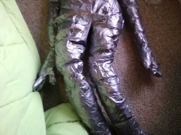 Fijar el estómago y el pecho a la pelvis, luego la materia. Usé una almohada pequeña para todo. Aquí viene la parte difícil.