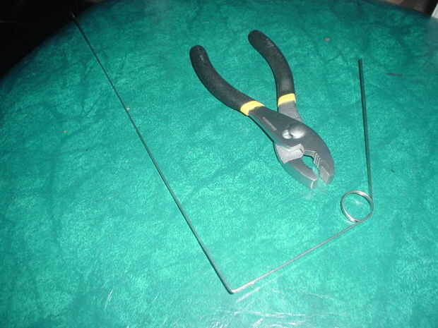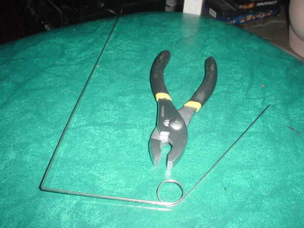 Ángulo recto, que es. Con un par de pinzas, doble un ángulo de 90 grados en el metal en algún lugar alrededor de las 3/4 la longitud del lado de la selección. En otras palabras, si usted hizo el selección final 8 pulgadas del lazo, hacer esta curva en unos 6 o así. Una vez más, estas medidas no serán exactas. Utilizar lo que se ve bien.