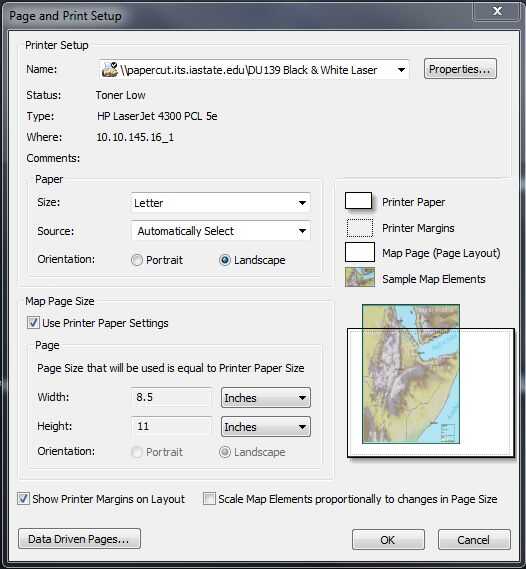 Si crees que el mapa es el más adecuado para una orientación diferente, necesita cambiar la orientación del mapa. Esto se puede hacer clic en archivo y haga clic en página y configuración de impresora. Una vez que han abierto la caja de diálogo de página y configuración de impresora, usted cambiará entonces la orientación de retrato a paisaje en la sección papel del cuadro de.