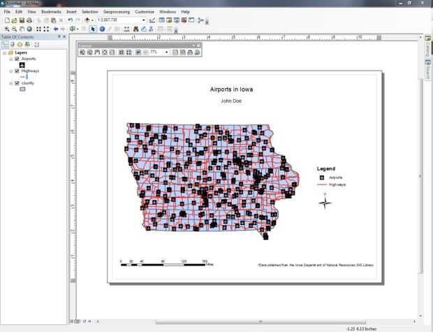 Ahora que han cambiado el mapa para una vista de diseño y han puesto el mapa en la orientación correcta ahora es tiempo de agregar información al mapa como un título, leyenda, la flecha del norte, escala y fuente de datos. Todos ellos pueden encontrarse haciendo clic en insertar en la barra de herramientas superior.