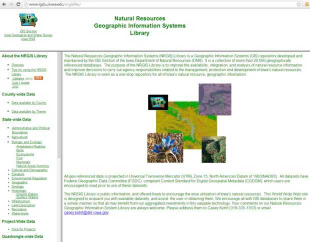 Sin reunir todos los datos, un mapa en ArcGIS sería nada; así que es muy importante encontrar buenos datos. Hay varios sitios web que tienen datos para usar en ArcGIS, pero llevará a un sitio en particular para este tutorial: http://www.igsb.uiowa.edu/nrgislibx/ este sitio web fue desarrollado por el Departamento de recursos naturales de Iowa y es una biblioteca de sistemas de información geográfica de los recursos naturales con una plétora de datos SIG relacionados con el estado de Iowa.