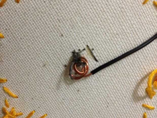 El siguiente paso es un poco complicado, pero fácil si tiene cuidado! Extremos del cable positivo de la bobina (para que la parte pelada hace una bonita espiral) coinciden con estos espirales a sus respectivas formas de fieltro y coloque la bobina de alambre y el cierre con hilo conductor. Para asegurarse de que la conexión es fuerte, te recomiendo el hilo conductor alrededor del alambre de embalaje varias veces y coser a través de los cuatro "orificios" en el complemento sewable! Aquí le damos la espalda de ella como se verá.