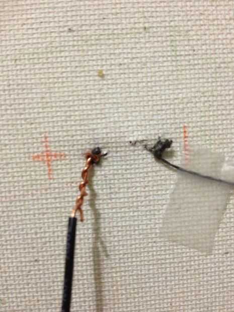 A continuación, coloque cuidadosamente sus luces a la lona. Primero, asegúrese de que cada una de las luces se orientan en la misma dirección (negativo lados lados positivos, una manera de otra manera)--esto le ahorrará un dolor de cabeza más adelante por el camino. A continuación, sujete con conductor de hilo (esto es importante--utilizará el hilo conductor para conectar al cable positivo y también para unir a una cadena larga que será la conexión negativa). Aquí está un primer plano de una de las luces en la parte posterior de la tela, puede ver que etiquetar los lados positivos y negativos claramente, por si acaso. (Esta imagen muestra la luz después de que os adjunto el hilo y el hilo negativo, que cubrirá en el paso siguiente).