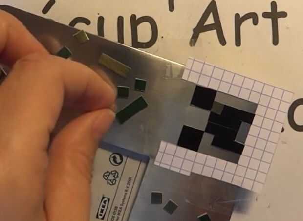 Este corte de las piezas puede utilizarse para pegar en el marco de imagen y hacer su cara de creeper. Ahora recortar varias piezas verdes de bolsita de café para acabar la cara.