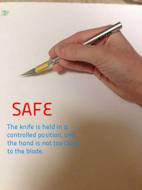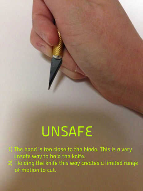 ADVERTENCIA: Exacto las cuchillas son muy filosas. Tomar nota de esto como usted. Su mano no dominante nunca debe ser cualquiera menos de cuatro pulgadas de la hoja y la mano que sostiene que el cuchillo debe mantenerlo como un lápiz de manera que estás cómodo y familiarizado con. Ver la imagen para ver más ejemplos. También, asegúrese de usar la almohadilla de corte. Exacto cuchillos pueden rebanar a través de la alfombra, ropa, mesas de madera y piel. Proteger estas superficies con la estera.