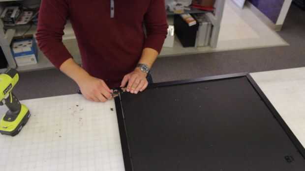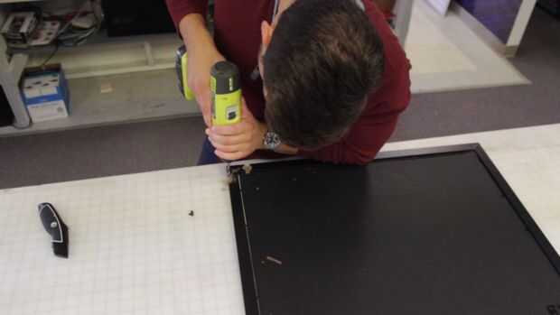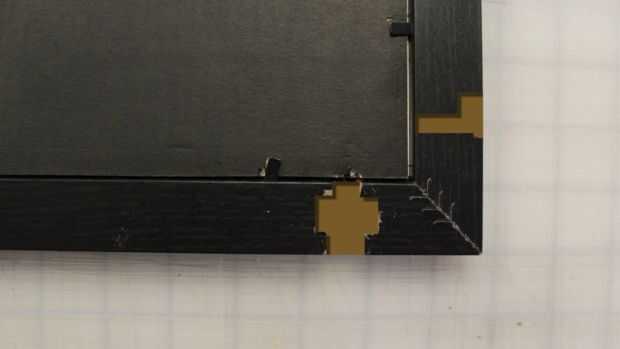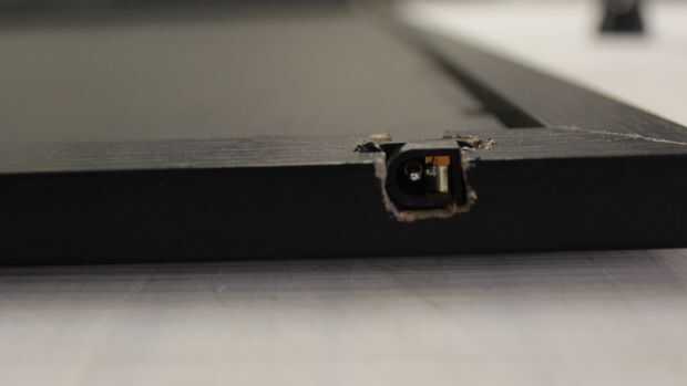 Vamos a receso el adaptador de interruptor y alimentación en el marco. Estaba sin tallar herramientas, así que perforó una serie de agujeros y el marco tallado con un cuchillo en su lugar. Seguí prueba de montaje de la pieza y luego tallar la forma hasta que ajuste correctamente.
