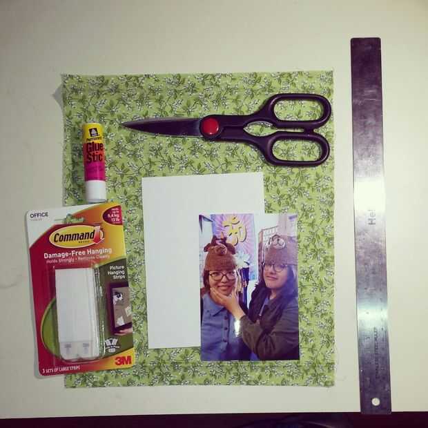 Usted necesitará una fotografía que se desee colgar, papel, tijeras, pegamento, una regla, los sujetadores colgantes de comando y una máquina de coser.