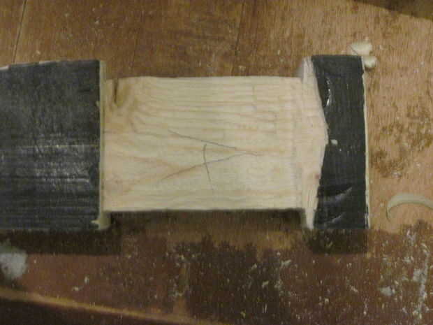 Después de recibir todas las piezas de cortan listo empezar a formar. A partir de la manija, traza el patrón de la cabeza del martillo a cada lado. Siguiente medida en pulgadas de 1/4 de cada borde y de la parte superior e inferior. Una vez marcado, empezar a quitar la madera. Usé la punta de la escofina para mi Dremmel, Sierra de marquetería y cinceles para hacer esto.