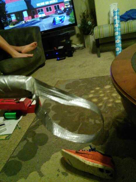 ahora, en cualquier color elija, toma un pedazo largo de cinta del conducto y doblar por la mitad. el lugar ambas puntas en el extremo del martillo y envoltura de varias capas de conducto de cinta alrededor de ella. Asegúrese de que usted Envuelva bien si planeas swingin'alrededor.