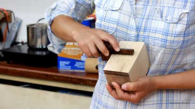 Lo primero de todo, estoy haciendo que las clavijas de mi medidor de escoplear esté a la misma distancia como mi cincel, que es 3/4 de pulgada. Entonces estoy haciendo que los pines están situados en el centro de mi bloque, estoy probándolo y ajuste.