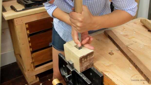 A continuación se trata de limpiar el interior de la cabeza, y estoy usando un formón más fino ahora, con el fin de montar el asa. Entonces tratando de la manija en ver si cabe, haciendo picar un poco más y así sucesivamente.