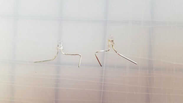 Tomar la delantera más larga de un LED y doble 2/3 de él hacia afuera. Tomar el último tercio de la misma y doblar espalda recta. Después, doble el cable más corto hacia el exterior. Mira las fotos para una mejor idea de cómo debe. Repita para el otro LED.